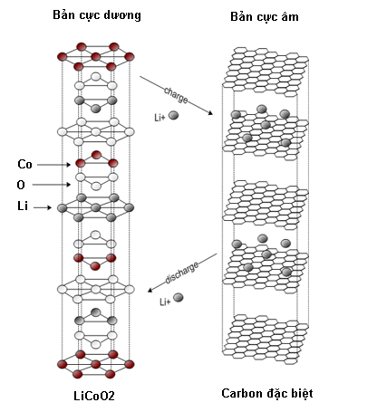 Hệ thống lưới phương trình hóa học đem đến theo hướng thuận nghịch. Các phân tử ion dương Li+ chuyển tới cực âm rồi nhận Carbon ở nơi đó. Dựa theo nguyên tắc trên lí thuyết, báo báo pin full khi đã chấm dứt nguyên tử Li+ hay các Carbon hết dấu hiệu cài đặt về cực âm.